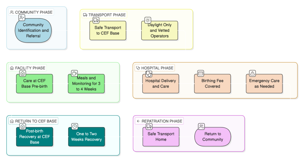 - Postnatal Recovery: Following hospital discharge, mothers return to the CEF facility for early postnatal recovery and observation.